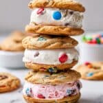 Celebrate the 4th of July with these festive ice cream sandwiches made from chewy, chewy homemade chocolate chip cookies studded with red, white, and blue M&Ms, filled with your choice of ice cream. Perfectly soft and flavorful, these cookies are baked to golden perfection and paired with creamy ice cream to create a nostalgic, refreshing summer treat.