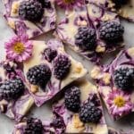 This 6 Ingredient Frozen Blackberry Yogurt Bark is a refreshing, easy-to-make frozen treat perfect for a healthy snack or dessert. Featuring creamy Greek yogurt swirled with sweet blackberry jam, topped with fresh blackberries, drizzled with melted white chocolate, and sprinkled with crunchy brown rice crisp cereal, it offers a delightful combination of flavors and textures. Simply spread, freeze, and break into pieces for a satisfying, guilt-free indulgence.
