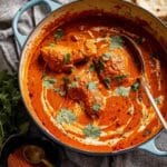A large light blue pot filled with a thick, rich orange curry with creamy swirls on top, showing multiple pieces of chicken partially submerged in the sauce. Bright green cilantro leaves sit scattered on the curry's surface, adding fresh color contrast. The pot rests on a textured gray cloth, with a piece of flatbread and a small black bowl containing orange spice powder and a gold spoon visible at the bottom edge. The curry has a smooth, slightly oily texture with some darkened spots on the chicken pieces. photo taken with an iphone --ar 4:5 --v 7