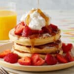 A stack of four thick, golden-brown pancakes sits on a white plate, with a small section cut out to show the soft, fluffy inside texture. On top of the stack is a dollop of smooth, white whipped cream and a whole red strawberry partially embedded in the cream. Around the pancakes on the plate are several thin slices of bright red strawberries. A slight drizzle of syrup glistens on the top pancakes. In the background, there is a glass of yellow-orange juice on a white marbled texture surface. photo taken with an iphone --ar 4:5 --v 7
