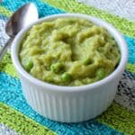 A white ceramic ramekin filled with chunky green pea mash that has a thick, slightly lumpy texture with some visible pea pieces. The ramekin sits on a colorful woven placemat with stripes in bright green, blue, aqua, and white, placed on a white marbled surface. A silver spoon is partially visible on the left side near the ramekin. The lighting is natural, showing the smooth and coarse parts of the mash clearly. photo taken with an iphone --ar 4:5 --v 7