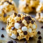 The image shows a close-up of a snack ball made of light golden popcorn mixed with white marshmallows and scattered dark chocolate chips on top and inside. The ball has three main visible layers: the fluffy, puffed golden popcorn forms the outer bulk, rounded white marshmallows are embedded within the middle and base layers, and the small smooth, dark chocolate chips are sprinkled generously over the top and throughout the popcorn. The snack rests directly on a metal tray with a few loose chocolate chips lying around. The background is softly blurred with more identical snack balls visible. photo taken with an iphone --ar 4:5 --v 7