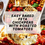 This baked feta chickpeas dish is a flavorful and easy-to-make Mediterranean-inspired meal. Roasted cherry tomatoes, chickpeas, and creamy feta combine to create a warm, saucy delight perfect for serving with toasted bread.