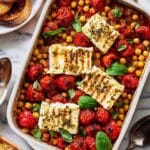 This Baked Feta Chickpeas recipe combines juicy roasted cherry tomatoes, tender chickpeas, and creamy feta cheese baked to perfection. Infused with garlic, olive oil, and a touch of red pepper flakes, this Mediterranean-inspired dish is garnished with fresh basil and served with toasted bread, making it a flavorful and easy-to-make appetizer or light meal.