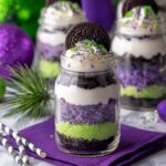 These Beetlejuice Mini Trifles are a fun, colorful dessert perfect for parties or Halloween celebrations. Layers of vibrant green and purple cake cubes, creamy filling, and crunchy Oreos come together in individual jars for a delightful treat.