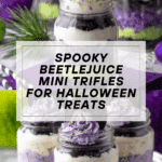 Beetlejuice Mini Trifles are a spooky and colorful dessert perfect for Halloween or themed parties. These mini trifles feature layers of green and purple tinted white cake cubes, creamy vanilla pudding filling, crushed Oreos, and festive sprinkles, all beautifully assembled in individual jars for a fun and delicious treat.
