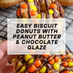 Keywords: Biscuit dough donuts, peanut butter glaze, chocolate glaze, fried donuts, Reese’s Pieces donuts, homemade donuts, easy dessert, sweet snack
