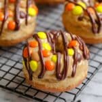 - Assemble Donuts: Empty Reese’s Pieces into a medium bowl. Spread dollops of peanut butter glaze onto each donut. Immediately dip the glazed side into Reese’s Pieces to coat the surface.