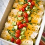 - Prepare Baking Dish: Preheat your oven to 350ºF. Lightly spray a 13×9 inch baking dish with non-stick cooking spray and pour about 1/3 cup of green enchilada sauce evenly into the bottom of the dish.