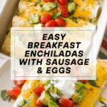 These Breakfast Enchiladas combine scrambled eggs, savory breakfast sausage, and melted Mexican cheese smothered in flavorful green enchilada sauce. Perfectly baked and served warm, this hearty dish makes for a delicious and satisfying morning meal with a spicy twist.