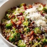 A vibrant and crunchy Broccoli Pearl Crunch Salad featuring tender-crisp marinated broccoli, nutty pearl couscous studded with juicy dried cranberries, and a flavorful mixture of salami, almonds, and red onion. Tossed in a tangy red wine vinaigrette with a hint of honey and Dijon mustard, finished with a sprinkling of grated parmesan cheese for a delightful combination of textures and flavors.