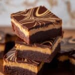 This image shows square brownie pieces with three visible layers: the bottom layer is a dark, rich chocolate brownie; the middle layer is a creamy, light brown peanut butter filling; and the top layer is a smooth, dark chocolate ganache with thin, swirling lines of peanut butter on the surface. The brownies are stacked closely together on a wooden surface with a white marbled texture background. The top chocolate layer has a shiny, glossy finish that reflects some light, making the swirled design stand out clearly. photo taken with an iphone --ar 4:5 --v 7