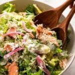 A vibrant Celebration Salmon Salad featuring tender hot smoked salmon, crisp kale and cos lettuce, pickled red onions, juicy seasonal fruit, and a creamy homemade yoghurt ranch dressing. Perfectly balanced with fresh herbs, parmesan, and a bright lemon-olive oil dressing, this salad is an impressive yet easy dish for gatherings or a healthy meal.