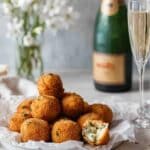 The image shows a pile of round, golden-brown fried balls with a crispy texture on a white plate lined with white paper. One ball is broken open, revealing a soft, creamy white interior mixed with small green herbs. The plate sits on a white marbled surface, with a bottle of sparkling wine with a green body and gold foil neck to the right, and two empty tall clear glasses behind it. White flowers in a clear vase are blurred in the background. A woman's hand is gently touching one of the balls on the plate. photo taken with an iphone --ar 4:5 --v 7