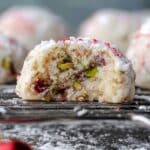 Cherry Pistachio Snowballs are tender, buttery cookies studded with toasted pistachios and sweet maraschino cherries. Rolled in shimmering confectioner’s sugar and red sanding sugar, these festive treats are perfect for holidays or anytime you want a delicate, nutty cookie with a pop of color.