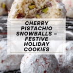 These Cherry Pistachio Snowballs are delightful buttery cookies studded with toasted pistachios and sweet maraschino cherries, flavored with almond and vanilla extracts. Soft and crumbly, these festive treats are rolled in a sparkling mixture of confectioner’s sugar and red sanding sugar for a charming snowball effect, perfect for holidays and special occasions.