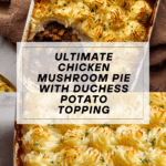 This Chicken Mushroom Pie with Duchess Potato Lid is a hearty, comforting dish featuring tender seared chicken thighs and sautéed mushrooms in a rich Guinness-infused gravy. Topped with decorative swirls of creamy duchess potatoes baked until golden, this pie is a perfect cozy meal for family or guests, blending deep savory flavors with a crisp cheese finish.
