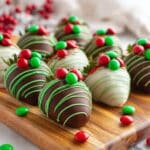These Christmas Lights Chocolate Covered Strawberries are a festive and delicious treat perfect for holiday celebrations. Fresh strawberries are dipped in rich milk and white chocolate, then decorated with green chocolate drizzles and colorful mini M&Ms to mimic Christmas light strands, creating a fun and visually appealing dessert.