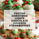 These Christmas Lights Chocolate Covered Strawberries are a festive and fun holiday treat. Combining rich milk and white chocolate with colorful green drizzle and mini M&M “bulbs,” they bring holiday cheer to any gathering. Perfect for parties or a sweet seasonal snack!