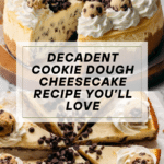 This Cookie Dough Cheesecake is a decadent dessert featuring a chocolate chip graham cracker crust, creamy cheesecake studded with mini chocolate chips, and edible cookie dough pieces baked inside and as a decorative topping. Finished with a fluffy vanilla whipped cream and extra chocolate chips, this no-bake cookie dough melds perfectly with rich cheesecake for an indulgent treat.