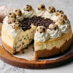 - Decorate and Serve: Pipe 8 large whipped cream swirls around the cheesecake perimeter, place chilled cookie dough balls on top, sprinkle with more mini chocolate chips, and enjoy!