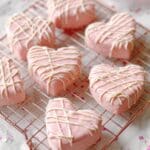 8. Coat the Cakes: Dip each assembled heart cake into the pink melted chocolate, ensuring it is completely covered. Place the coated cakes on a wire rack over a baking sheet to allow excess chocolate to drip off and for the coating to set.