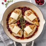 This Cranberry Chicken recipe features tender, pan-seared chicken breasts topped with a tangy, sweet homemade cranberry sauce and melted brie cheese. It’s a delightful blend of savory and fruity flavors, perfect for a cozy dinner or special occasion meal.