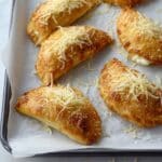 The image shows five golden brown crescent-shaped baked pastries on a tray lined with white parchment paper. Each pastry has a flaky, crispy surface with a slightly shiny texture and is topped with a layer of melted, shredded cheese that is light yellow and spread unevenly. Some pastries show a small amount of white creamy filling peeking out from the side. The tray is placed on a white marbled surface with some scattered cheese shreds nearby. The photo taken with an iphone --ar 4:5 --v 7
