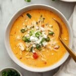 A white bowl filled with a creamy orange soup that has visible shredded chicken and small pieces of red pepper throughout. The soup is topped with a small mound of white crumbled cheese and scattered green onion slices. A gold spoon rests inside the bowl on the right side. The bowl is placed on a white marbled surface with a small bowl of chopped green onions nearby and a white cloth partially visible in the upper right corner. Photo taken with an iphone --ar 4:5 --v 7