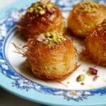 A close-up of four small, round pastries made from thin, golden-brown, crispy strands layered and twisted to form a nest-like structure, placed on a white plate with a bright blue, floral, and patterned rim. The pastry in the front center is topped with a glossy, amber syrup and sprinkled with finely chopped green pistachios and bits of red nuts, giving it a textured and colorful top layer. The other three pastries have a smooth, shiny golden surface with slightly darker brown toasted edges. The plate rests on a white marbled surface. photo taken with an iphone --ar 4:5 --v 7