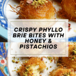 Keywords: phyllo brie bites, crispy brie appetizer, baked brie, phyllo dough recipe, party appetizers, honey pistachio brie, easy baked appetizers