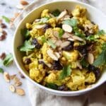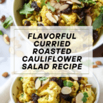 A vibrant and flavorful Curried Roasted Cauliflower Salad featuring caramelized cauliflower florets tossed with a spiced yogurt dressing, crunchy toasted almonds, sweet raisins, and fresh cilantro. This easy-to-make salad is perfect as a light lunch or a healthy side dish with a unique blend of textures and warm curry spices.