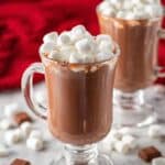 Two clear glass mugs filled with smooth light brown hot chocolate, each topped with a thick layer of small white marshmallows piled high, showing a soft and fluffy texture. The mugs stand on a white marbled surface scattered with more mini marshmallows and small chunks of milk chocolate. A bright red cloth is blurred in the background, adding warmth to the scene. The mugs have thick handles and are set close together, capturing a cozy and inviting look. Photo taken with an iphone --ar 4:5 --v 7