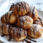 A stack of golden brown round dough balls arranged in layers on a white plate, each dough ball has a slightly crispy texture with a soft inside, drizzled with dark chocolate sauce creating thin curved lines over the top, and dusted lightly with white powdered sugar giving a frosted look. The plate is set on a white marbled surface. photo taken with an iphone --ar 4:5 --v 7