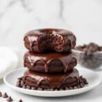 A stack of three thick, dark chocolate donuts covered in a shiny, smooth chocolate glaze that drips slightly down the sides. The top donut has a bite taken out of it, revealing a moist, dense, and rich chocolate interior. The donuts are placed on a white plate with scattered dark chocolate chips around the base. The background shows a white marbled texture with a clear bowl of chocolate chips slightly blurred behind the donuts. Photo taken with an iphone --ar 4:5 --v 7