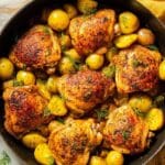 Keywords: duck fat chicken, roasted chicken thighs, roasted potatoes, cast iron skillet recipe, lemon garlic chicken, crispy chicken skin, oven roasted chicken
