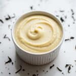 A close-up of a single layer of thick, creamy pale yellow puree with a smooth and swirled texture placed inside a white bowl with a subtle ridged pattern. The bowl sits on a white marbled surface scattered with small pieces of dark dried leaves around the bowl. Photo taken with an iphone --ar 4:5 --v 7
