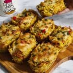 The image shows seven baked savory rolls placed on a wooden board with a handle, set on a white marbled surface. Each roll has multiple layers visible: a golden-brown crispy cheese top layer with melted and slightly browned texture, underneath a mixed layer rich with yellow shredded vegetables, green herbs scattered throughout, and small pieces of red peppers adding color. The rolls have a rough, textured surface with bits of herbs and cheese melting into the layers. At the top left, a woman’s hand is holding one roll, lifting it slightly above the rest. The background features a white cup with a cartoon chef logo to the right. photo taken with an iphone --ar 4:5 --v 7