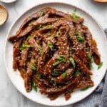 This Easy Korean Beef Bulgogi recipe is a flavorful and quick way to enjoy traditional Korean marinated beef. Tender slices of flank steak are marinated in a savory, sweet, and slightly spicy sauce made with pear, garlic, ginger, soy sauce, sesame oil, sriracha, and brown sugar. The beef is then quickly pan-cooked in a skillet to lock in all the delicious flavors. Perfect for serving over steamed rice for a satisfying meal.