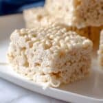 This recipe for Easy Rice Crispy Treats results in thick and chewy squares that are delightfully sweet and perfect for a quick homemade dessert or snack. Using simple ingredients like Rice Krispy cereal, butter, marshmallows, and vanilla, these treats come together quickly on the stovetop, then set in the fridge for a chewy, satisfying texture.
