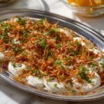 A round silver tray holds several curved white dollops of creamy sauce arranged evenly on its surface. On top of this creamy layer, there is a generous amount of thin, crispy, golden-brown fried onions scattered all over, adding texture and color. Small green bits of finely chopped herbs are sprinkled in between, providing a fresh contrast against the cream and onions. The overall look is warm and inviting with varied textures on a bright white marbled background, slightly blurred. photo taken with an iphone --ar 4:5 --v 7