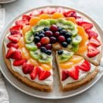 Keywords: fruit pizza, sugar cookie crust, cream cheese frosting, fresh fruit dessert, easy dessert, party dessert, summer fruit pizza