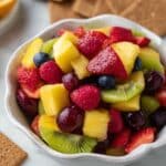 A vibrant and refreshing fruit salsa combining strawberries, kiwi, pineapple, raspberries, and blueberries, gently mixed with strawberry jam and brown sugar. Perfect as a sweet snack or a topping served with cinnamon sugar pita chips.