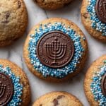 The image shows round cookies topped with a flat, round chocolate piece embossed with a menorah. Each cookie is covered with small blue and white round sprinkles that add texture and color contrast to the light golden brown cookie dough with visible chocolate chunks. The cookies are arranged closely on a surface with a white marbled texture. The chocolate menorah sits neatly in the center of each cookie, making a clear focal point. photo taken with an iphone --ar 4:5 --v 7