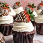 The image shows several chocolate cupcakes wrapped in dark brown paper liners, each topped with a thick, smooth swirl of white cream frosting. On top of the frosting, there is a large strawberry dipped halfway in milk chocolate, decorated with white chocolate drizzles forming elegant lines. The strawberries are fresh with green leafy tops intact, adding a pop of color. The cupcakes are arranged on a white marbled surface with a soft pink and white blurred background. photo taken with an iphone --ar 4:5 --v 7