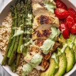 Keywords: Goddess Bowls, roasted asparagus, herb chicken, brown rice bowl, healthy bowl, Greek yogurt dressing, easy dinner, nutritious recipes