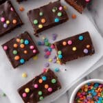- Add toppings and chill: Immediately sprinkle 2–3 tablespoons of rainbow candy-coated chocolate chips over the soft ganache. Transfer the brownies to the refrigerator and chill for 1-2 hours until the ganache is set.