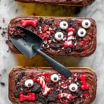 These Graveyard Mini Dirt Loaf Cakes are a fun and spooky Halloween treat perfect for parties. Moist mini loaf cakes are baked in individual pans, frosted generously with chocolate frosting, and topped with crushed Oreos to resemble dirt. Decorated with creepy candy eyeballs, skulls, and other Halloween-themed sprinkles, each mini cake transforms into a deliciously eerie graveyard scene accented with a mini dessert shovel for added festivity.