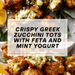 These Greek Zucchini Tots are a delicious, healthy twist on traditional potato tots, featuring grated zucchini combined with feta cheese, parmesan, panko breadcrumbs, and herbs. Baked until golden and crispy, they make a perfect snack or appetizer served with a refreshing minted yogurt dip and a squeeze of lemon.