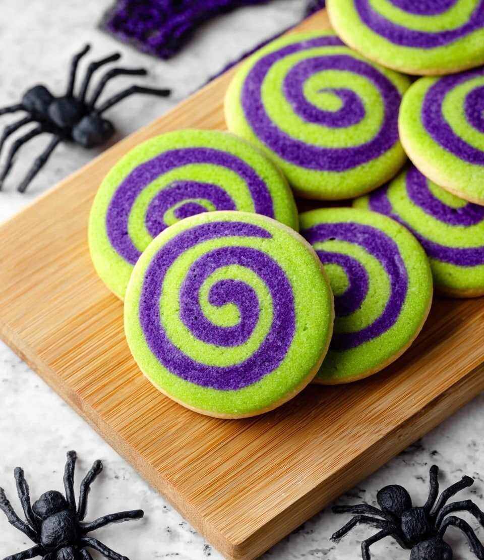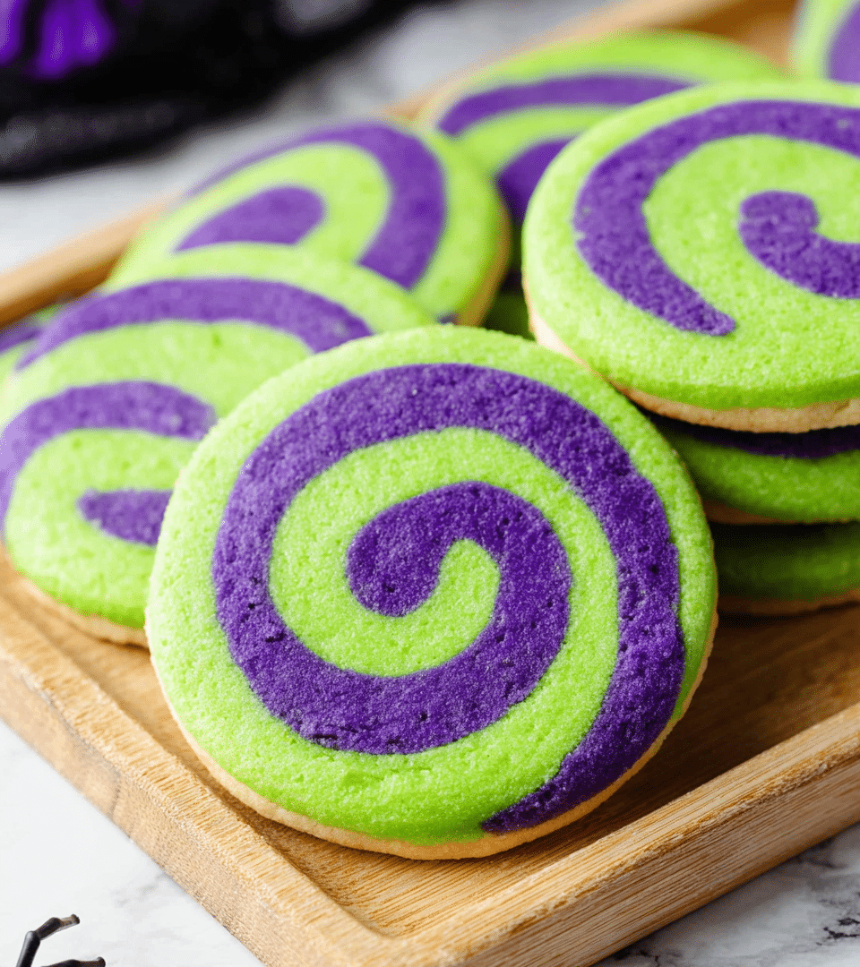 These Halloween Pinwheel Cookies are a festive treat featuring vibrant green and purple swirls. They are fun to make and perfect for spooky celebrations or anytime you want a colorful, buttery cookie.